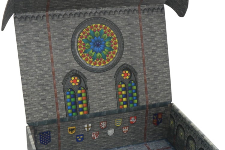 The outside and inside the box is stylized as a science fiction space ship or a fantasy castle.