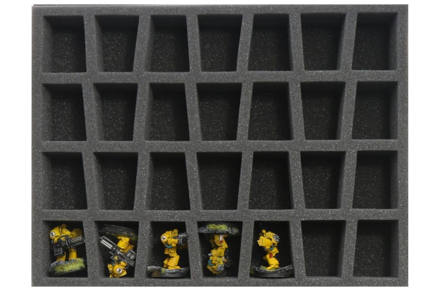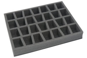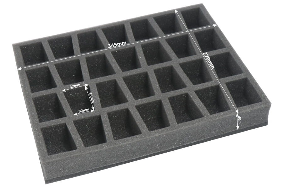 W piance znajduje się 28 wycięć w kształcie trapezu o wymiarach 32/42x55mm i głębokości 40mm. Pianka przeznaczona jest do pakowania, przenoszenia i przechowywania modeli na podstawkach 40mm.
