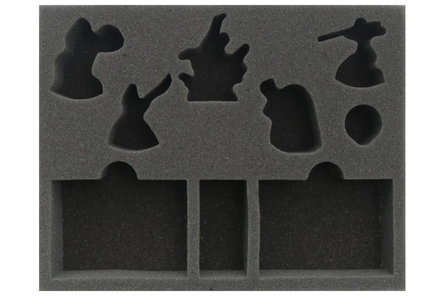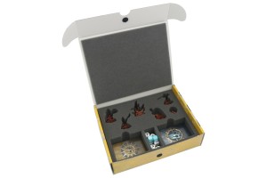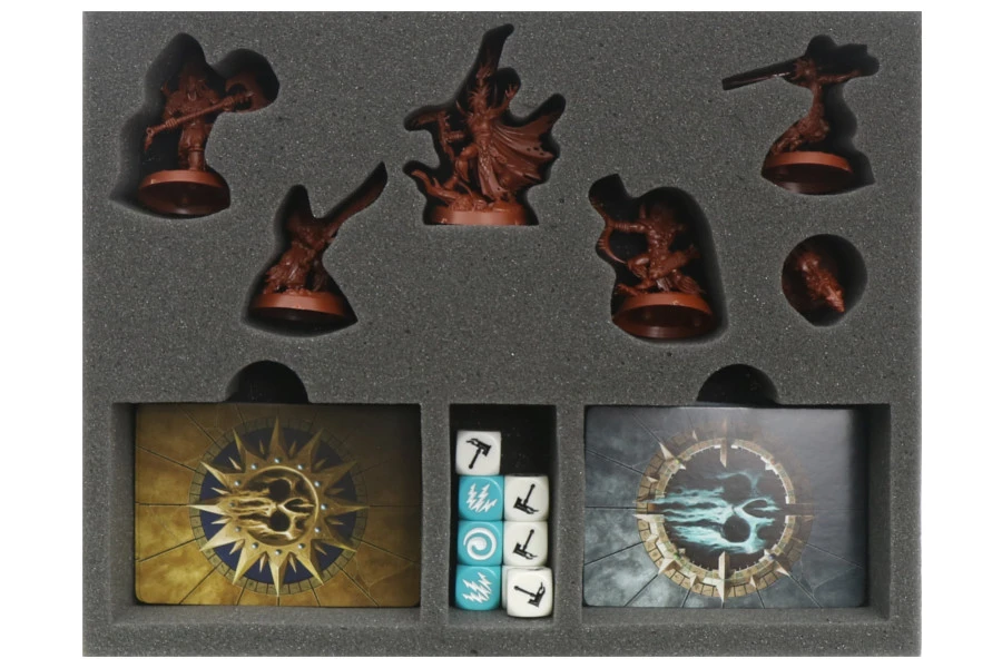 - pianki z wycięciami przygotowanymi na modele drużyny Godsworn Hunt oraz przegródkami na karty oraz kostki do gry;